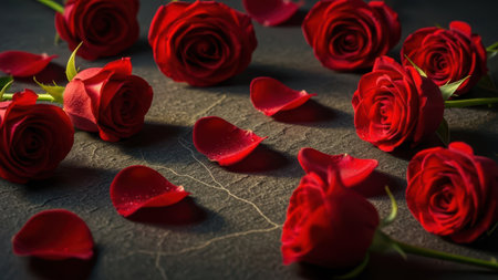 A collection of vibrant red roses are scattered across a dark, textured surface. Some roses are fully bloomed, while others are slightly wilted, with petals scattered around. The lighting highlights the rich color and delicate texture of the roses, creating a romantic and moody atmosphere.
