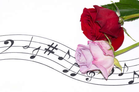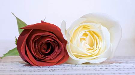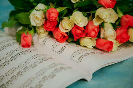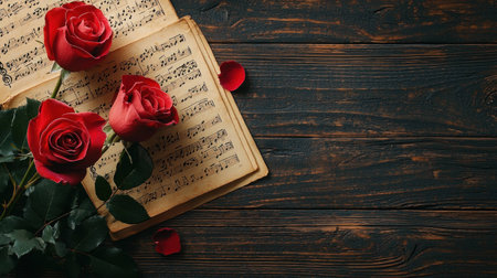 Beautiful red roses on vintage sheet music, representing romance and creativity with a warm color palette on a wooden background