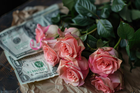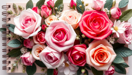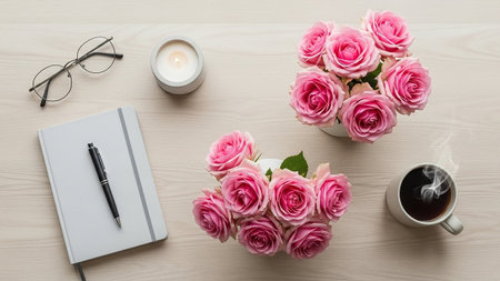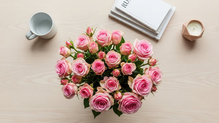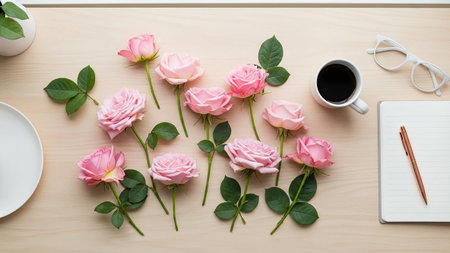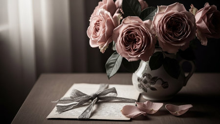A delicate arrangement of pink roses beside a handwritten note captures a warm and intimate moment, perfect for conveying love and romance.