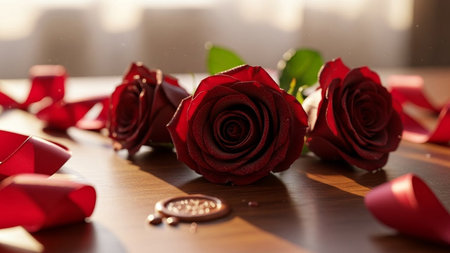 Romantic composition featuring vibrant red roses, scattered satin ribbon, and a wax seal on a polished wooden surface, illuminated by soft sunlight