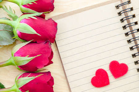 A close up image of pink roses on a wooden table with hearts. A romantic and beautiful arrangement of flowers.
