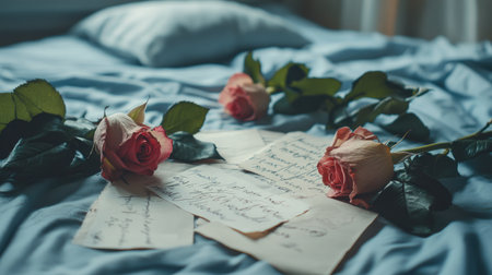 Broken roses and shredded love letters on an empty bed, capturing the essence of heartbreak and the pain of lost affection