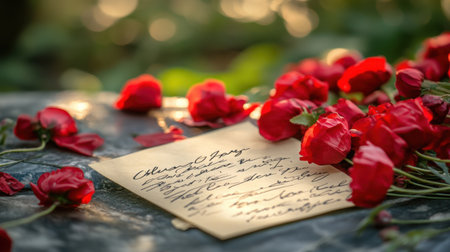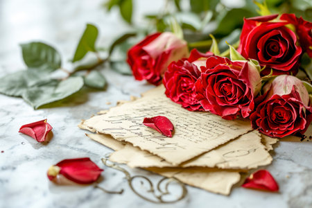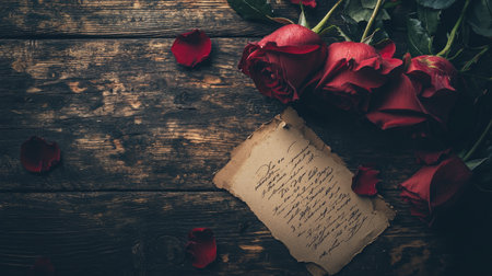 A vintage love letter lies on rustic wood, accompanied by red roses and scattered petals. This romantic scene evokes emotions of love and affection, perfect for celebrations.