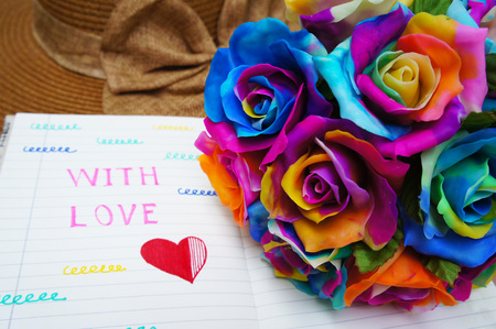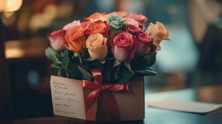 A gift box filled with multicolored roses tied with a ribbon, placed on a table with a handwritten note, symbolizing love and affection.