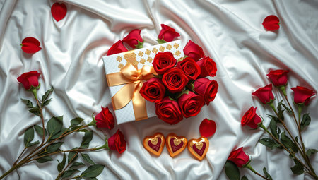 St. Valentine's Day present with small hearts, candles, a gift box, and red roses bouquet on a light background, creating a romantic love ambiance with copy space for text.