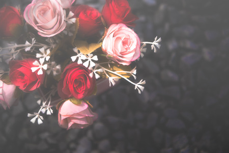 Beautiful bouquet of red and pink roses with raindrops on petals arranged against a dark backdrop