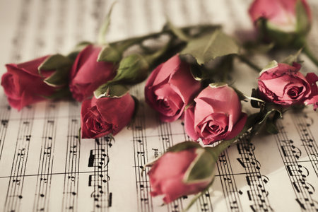 Music sheet and dead roses. The idea of the concept for love of music, for the composer, musical inspiration.