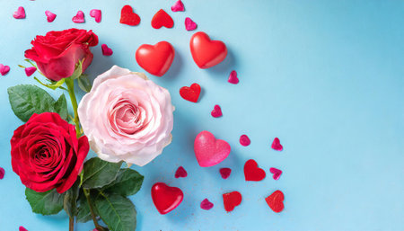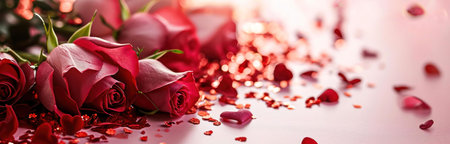 A close-up of red roses with heart-shaped confetti, symbolizing love and romance on Valentine's Day.