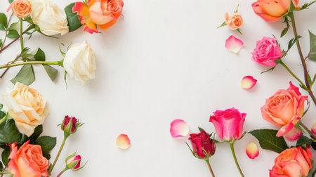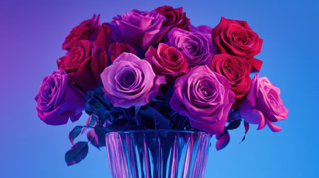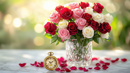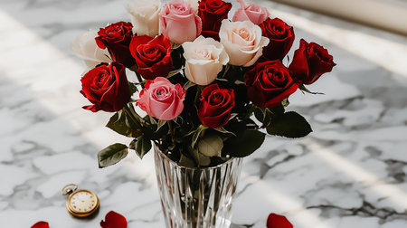 This image was generated using AI. Celebrate Rose Month with this vibrant and luxurious composition of fresh roses in shades of red, pink, and white. Elegantly arranged in a glass vase on a marble surface, the scene is enhanced by soft natural lighting and scattered rose petals, creating a romantic and sophisticated atmosphere, perfect for premium stock photography