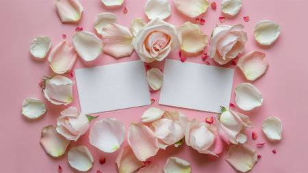 Two blank cards are surrounded by petals and leaves on a pink background, AI