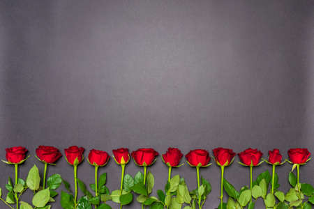 Border made of fresh red rose flowers on black background. Floral composition, greeting card for holiday event. Love, romance or Valentine's day concept. Flat lay, top view.