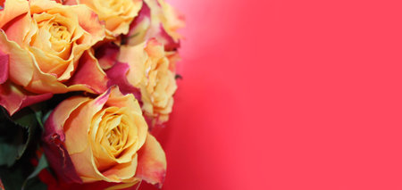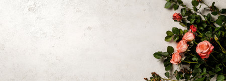 Background with a floral pattern of natural fresh red roses. view from above. A festive banner.