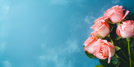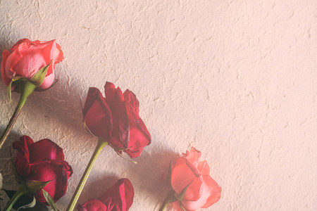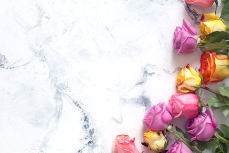 Rose composition on the colored background. Overhead top view, flat lay. Copy space. Birthday, Mother's, Valentines, Women's, Wedding Day concept.