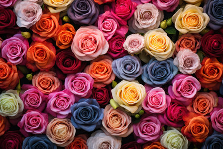 Dense cluster of multi-colored roses in bloom, captured close-up for vibrant, textured, and decorative floral background
