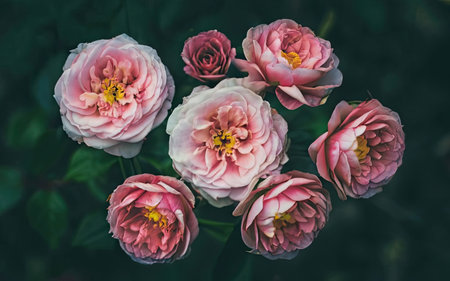 Beautiful pink roses arranged artistically in a vibrant garden setting during late spring, showing fresh blooms with delicate petals and lush green foliage