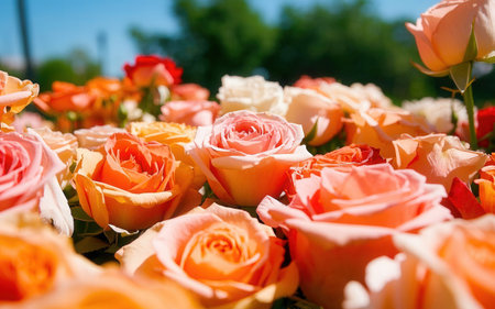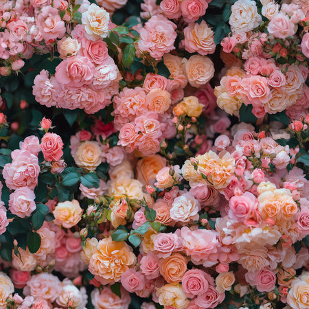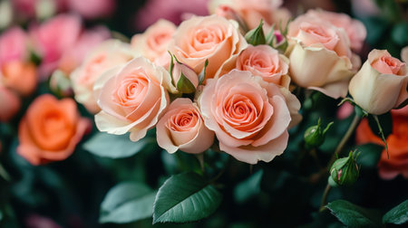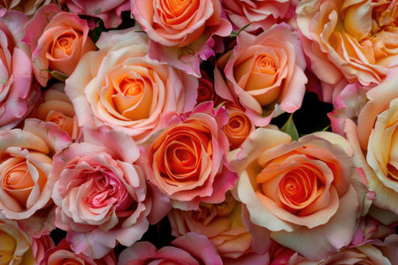 Close-up of beautiful, lush pink and orange roses, illustrating a romantic and vibrant floral pattern