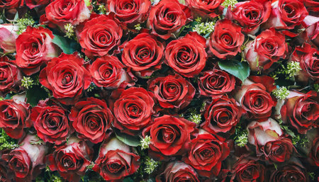 Close-up of vibrant red roses in full bloom, romantic floral background. Love and valentine concept