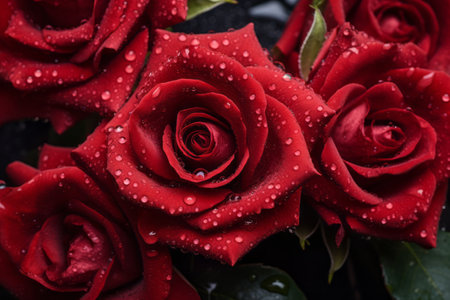 Close-up of fresh red roses with water droplets, symbolizing freshness and love