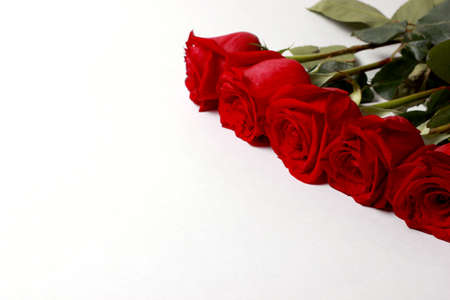 Five red roses on a white background with space for text