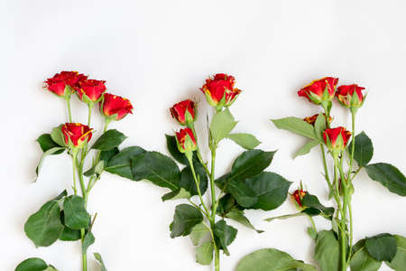 Blooming red roses on a white background. Top view.Creative flat lay, copy space.