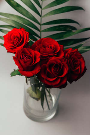 luxurious bouquet of large red roses close-up on a light background in the dark. low key photography, noir
