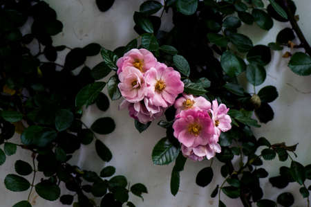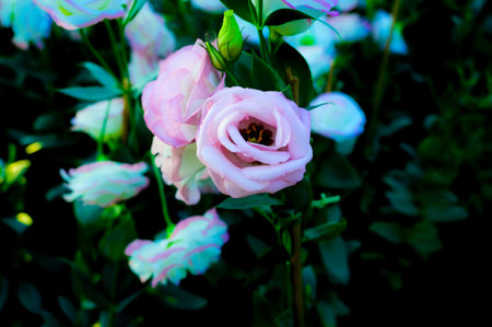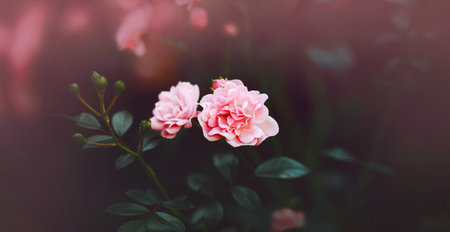 Beautiful pink delicate rose flowers bloom on a bush with dark leaves in the garden on a summer evening. The beauty of nature.
