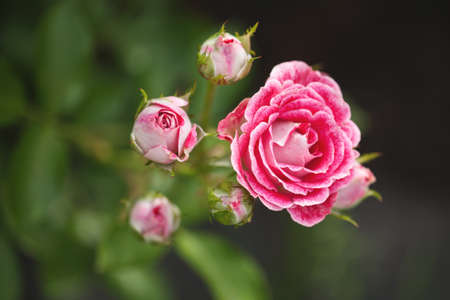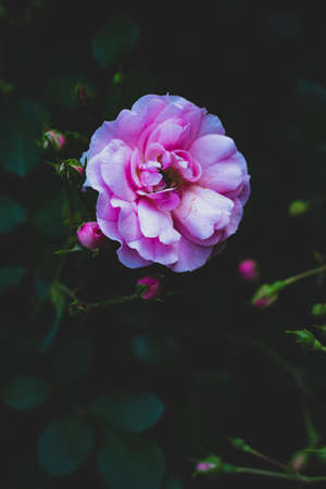 Beautiful pink rose in the garden on a dark background. Selective focus.