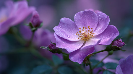 Beautiful pink rosehip flowers with drops of dew on the petals.
