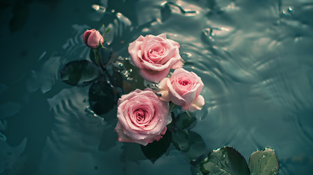 Pink roses and petals floating on the surface of calm water, creating a peaceful and serene composition that evokes a sense of tranquility.