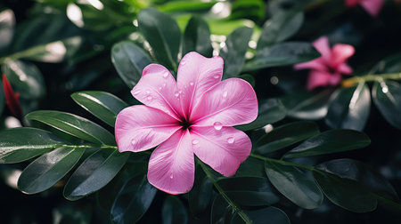 A pink periwinkle flower with water droplets on it and green leaves in background
