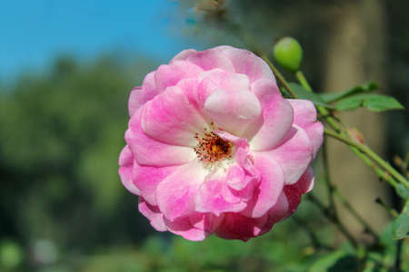 Pink rose blooming in the garden, close-up, selective focus.