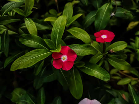 Nature photography of pink periwinkle or Nayantara flower with fresh green leaves, buds on branch of tree at garden. Beautiful tugger flowers in plant in bright morning sunshine. Copy space for text.