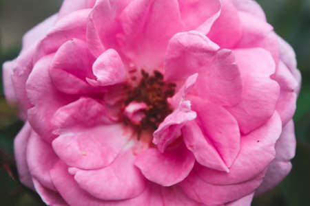 Pink rose close up macro photo. Beautiful rose in the fog garden. Floral abstract background..