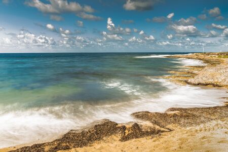 Waves of the Mediterranean sea break against a rock on Paphos beach in Cyprus