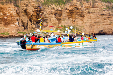 Puerto Lopez, Ecuador - July 31, 2015: The fishermen of the community of Puerto Lopez leave in their boats arranged with ribbons and balloons to participate in the Maritime Procession for the festivities of San Pedro and San Pablo, in the month of June, E