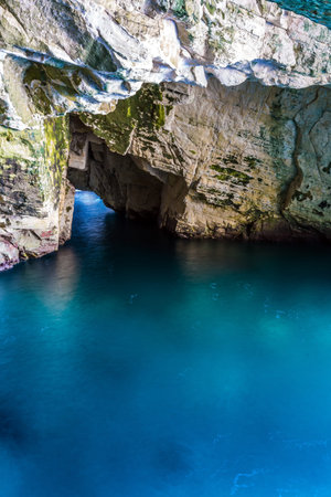Magnificent color of sea water - turquoise. Karst cave in the limestone mountain in northern Israel, on the border with Lebanon.