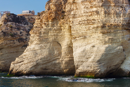BEIRUT, LEBANON - AUGUST 14, 2014: View of the sea coast in the Raouche. Is a residential and commercial neighborhood in Beirut. It is known for its upscale apartment buildings and cliff-side cafes.