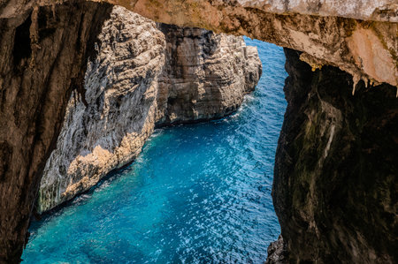 View from the inside of a stone grotto on the Mediterranean Sea off the coast of Sicily. Rocky shore of Milazzo cape, Sicily, Italy, Europe. Incredible morning seascape of Mediterranean sea.