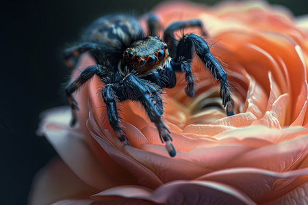 Big black spider resting on vibrant pink rose against dramatic dark background