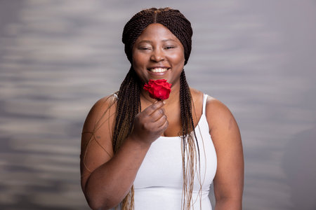 Positive African American model posing with red rose and vibrant smile, showcasing body positivity and self love against background. Reflecting acceptance and empowerment via natural look.