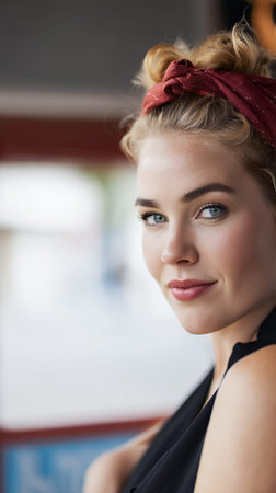 A young woman with blonde hair tied up with a red bandana smiles gently at the camera.