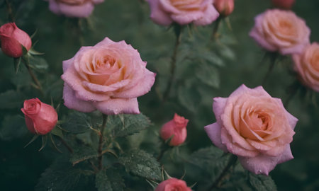 Beautiful soft pink roses in a dreamy garden setting, showcasing delicate petals and lush green foliage for a romantic and serene atmosphere