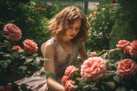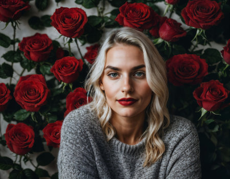 photo of beautiful woman in blonde hair color with red rose background, generative AI