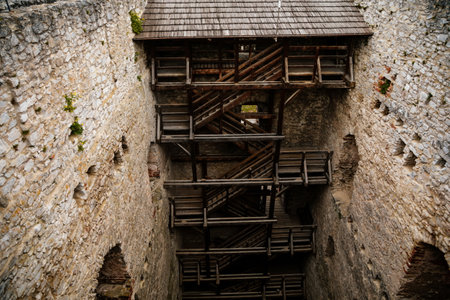 Stone gothic ruins of old medieval castle Rabi in National Park Sumava, ancient fortress in sunny spring day, landmark in countryside, stronghold on the hill, Rabi, Czech Republic, May 29, 2021