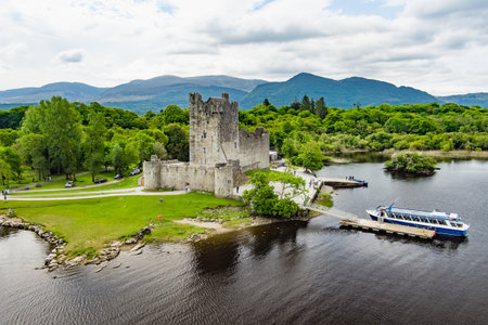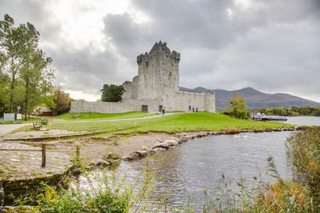 Killarney, Ireland, August 2019 People sightseeing and visiting beautiful, 15th century Ross Castle with dramatic storm sky and clouds, Ring of Kerry