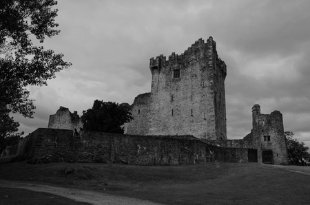 view of the remains of a castle during a cloudy day , Killarney -ireland black and white