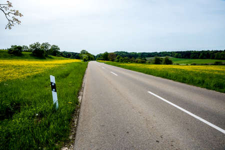Empty country road with a view of blue sky with clouds of clouds and trees and meadows in the Hunsrück