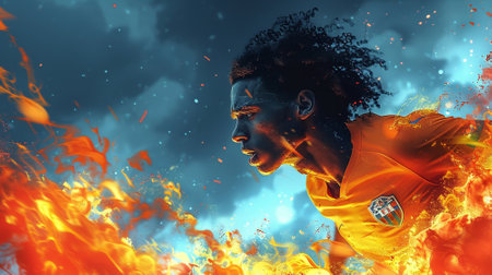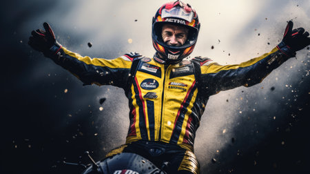 Triumphant motorcyclist at finish line close-up angle emphasizes emotion. Vibrant colors and joyful expression create striking image