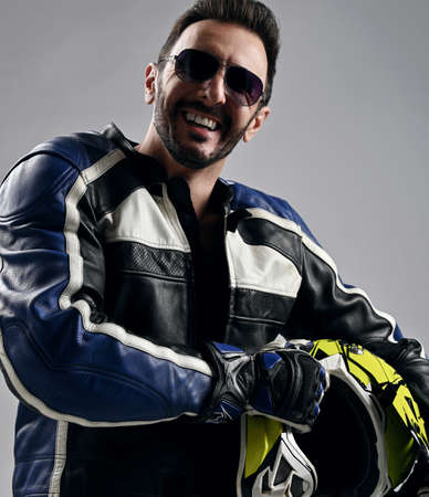 Happy smiling bearded man biker in motorcycle leather jacket and gloves stands holding his helmet and laughs