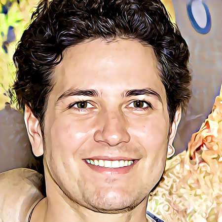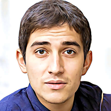 A close-up portrait of a young man with curly hair and a warm smile, set against a calming blue backdrop. His expressive eyes and friendly demeanor radiate positivity and approachability, inviting connection and warmth.